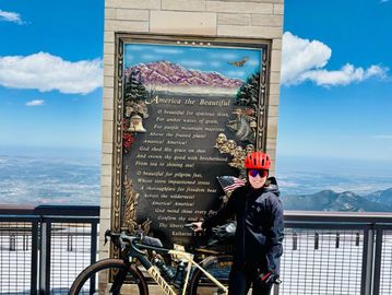 Joni summited Pikes Peak on May 17th, a wintery ascent with winds and temps that tested the hardiest of riders!